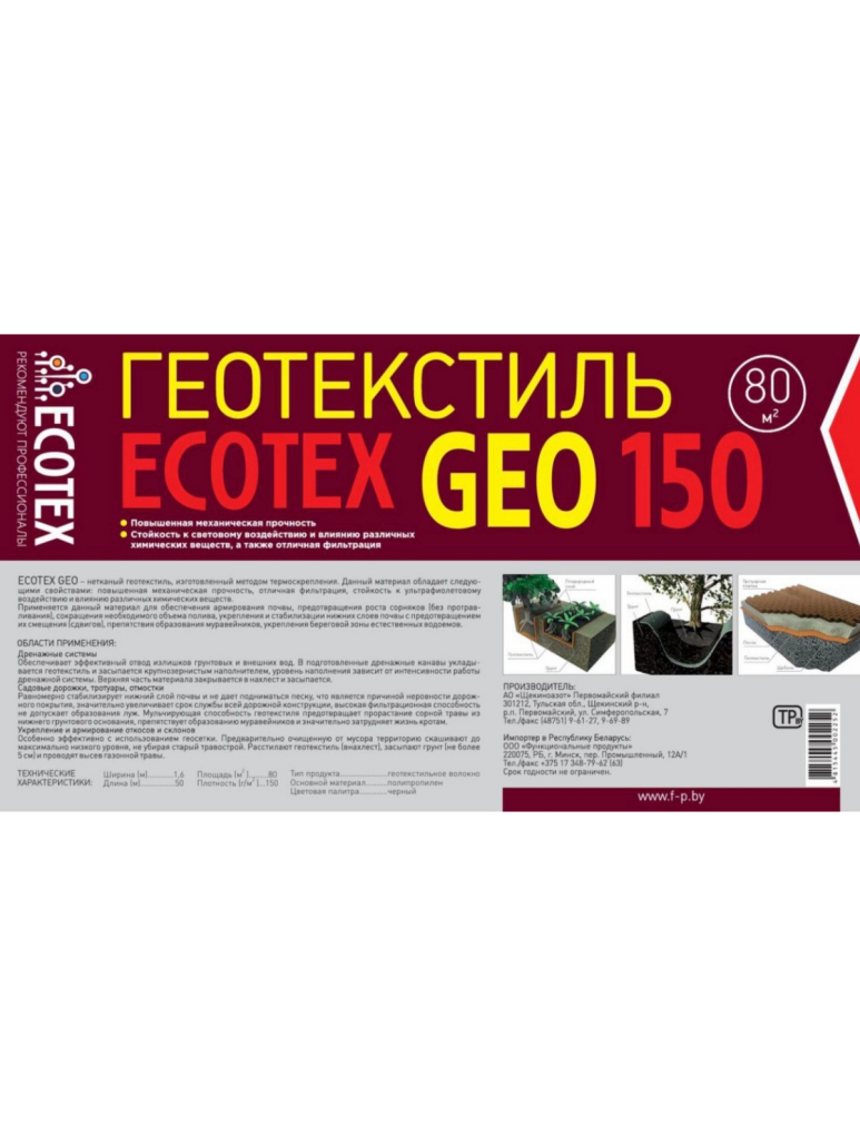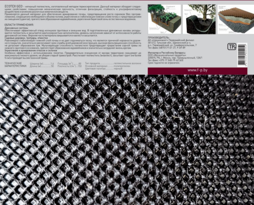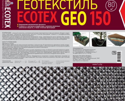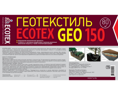 ECOTEX GEO – нетканый, садовый и строительный геотекстиль, изготовленный методом термоскрепления. Данный материал обладает следующими свойствами: повышенная механическая прочность, отличная фильтрация, стойкость к ультрафиолетовому воздействию и влиянию различных химических веществ. Применяется данный материал для обеспечения армирования почвы, предотвращения роста сорняков (без протравливания), сокращения необходимого объема полива, укрепление и стабилизации нижних слоев почвы с предотвращением их смещения (сдвигов), препятствия образования муравейников, укрепления береговой зоны естественных водоемов.