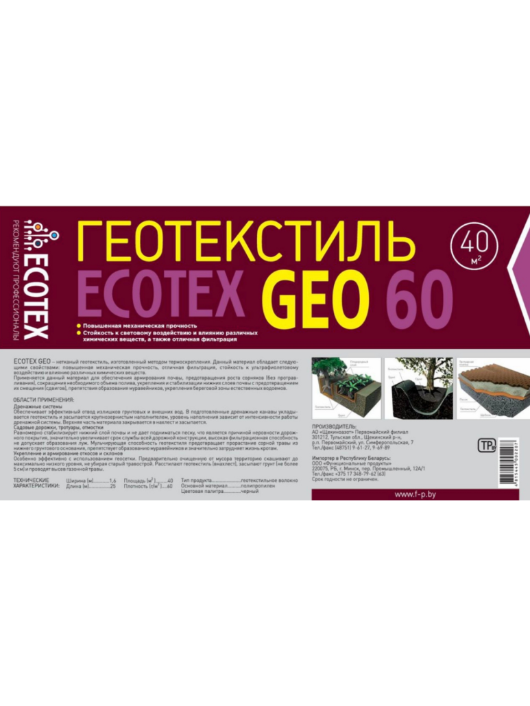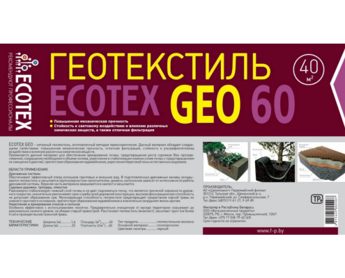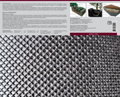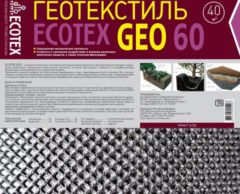 ECOTEX GEO – нетканый, садовый и строительный геотекстиль, изготовленный методом термоскрепления. Данный материал обладает следующими свойствами: повышенная механическая прочность, отличная фильтрация, стойкость к ультрафиолетовому воздействию и влиянию различных химических веществ. Применяется данный материал для обеспечения армирования почвы, предотвращения роста сорняков (без протравливания), сокращения необходимого объема полива, укрепление и стабилизации нижних слоев почвы с предотвращением их смещения (сдвигов), препятствия образования муравейников, укрепления береговой зоны естественных водоемов.