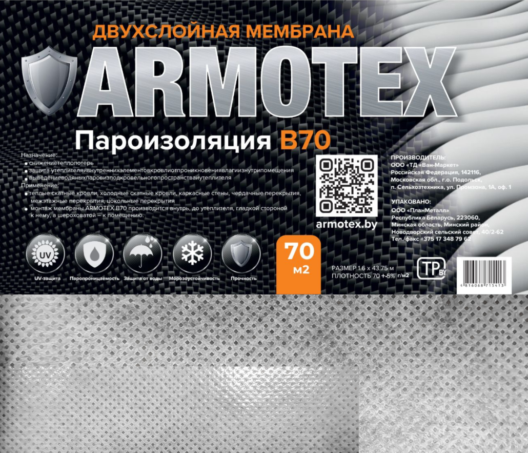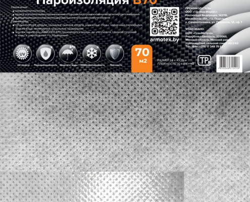 — выведение паров из утеплителяПрименение Гидро-пароизоляционная пленка ARMOTEX B70 применяется для защиты утеплителя и внутренних элементов стен и кровли от ппроникновения водяных паров изнутри помещения, защиты от ветра, а также обеспечивает выведение водяных паров из подкровельного пространства и утеплителя. Область применения: теплые скатные кровли, холодные скатные кровли, каркасные стены, чердачные перекрытия, межэтажные перекрытия, цокольные перекрытия.